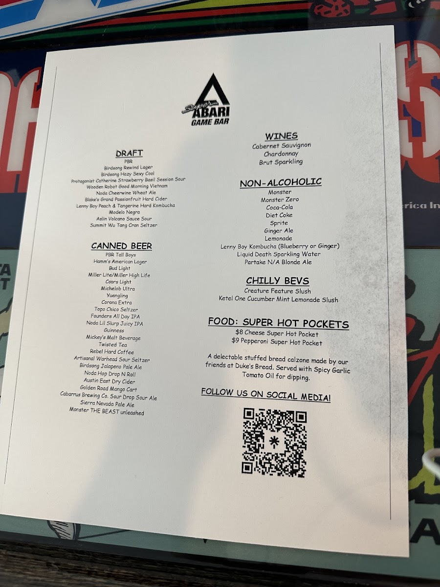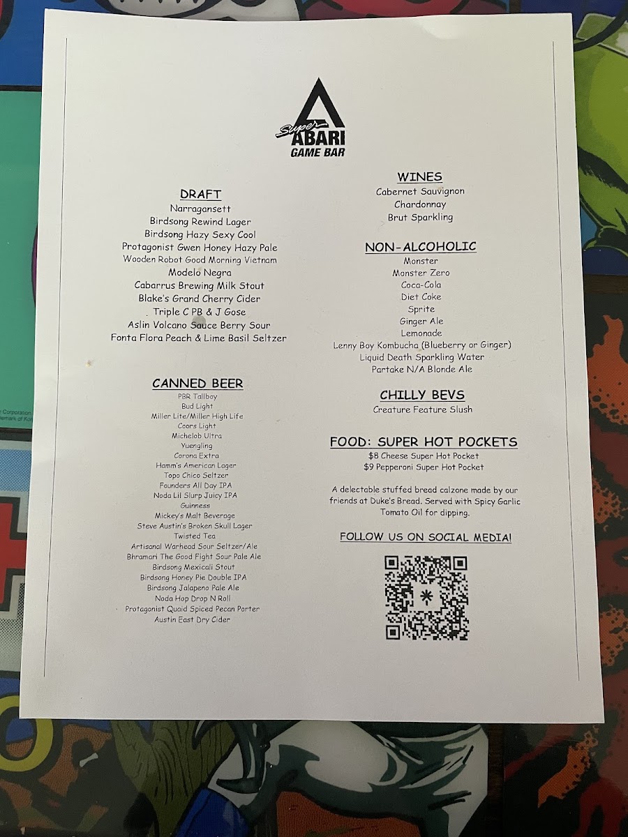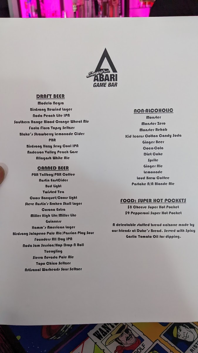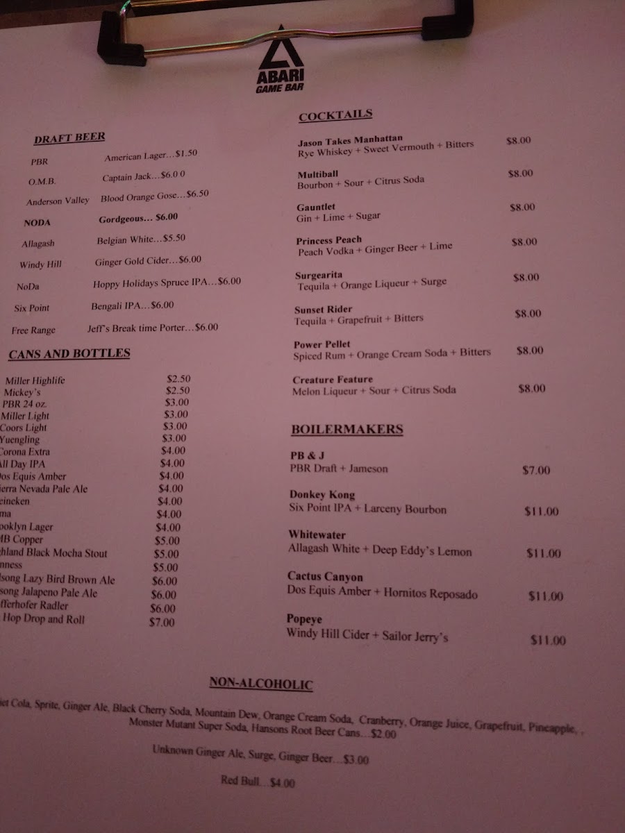 The menu at Super Abari Game Bar offers a straightforward selection of drinks that complement its lively yet laid-back arcade atmosphere. Expect a mix of approachable draft beers like PBR American lager alongside more distinctive brews such as Belgian white ales and IPAs, ideal for unwinding between games or hanging out with friends.